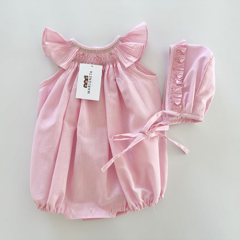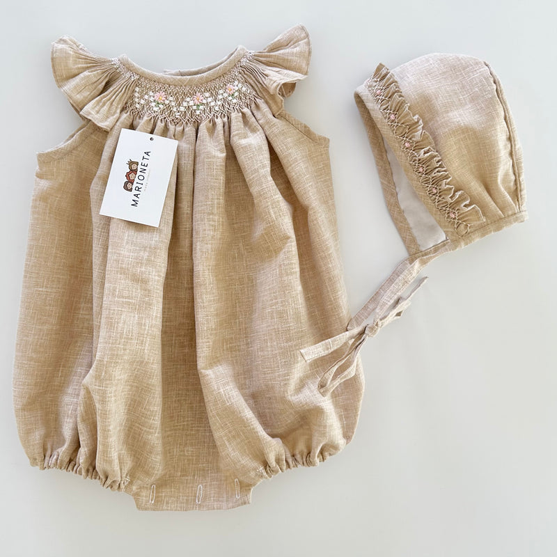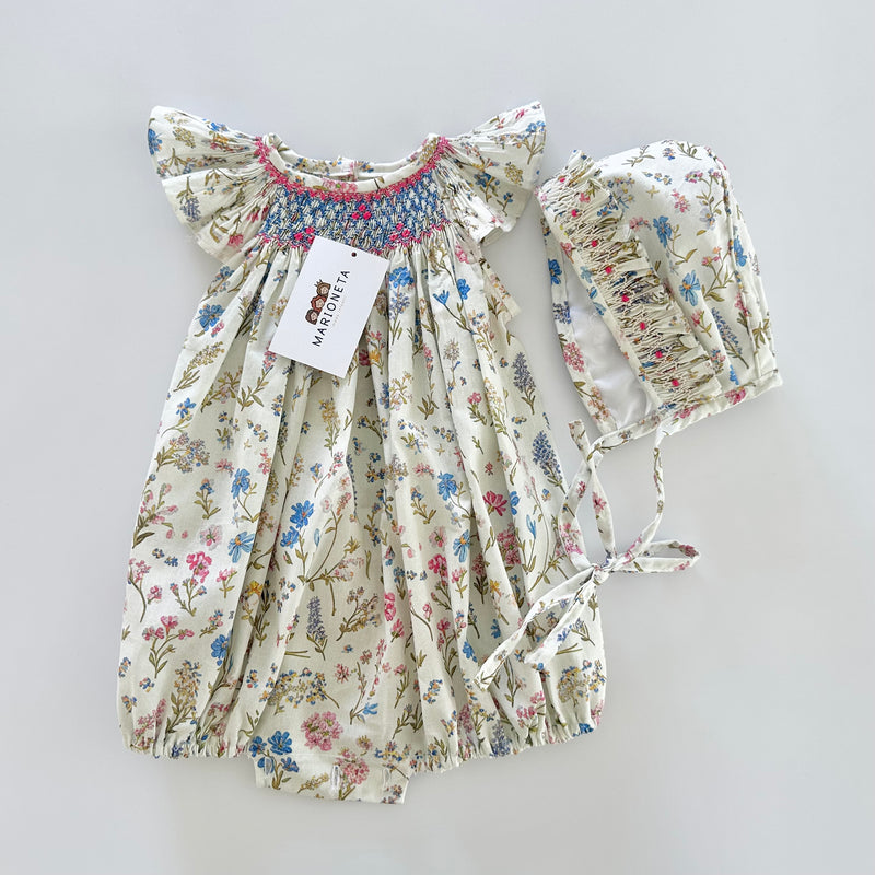 Vestido y braguita bordado hecho a mano floreado con cuello ivory para bebe niña| MARCA CARPI