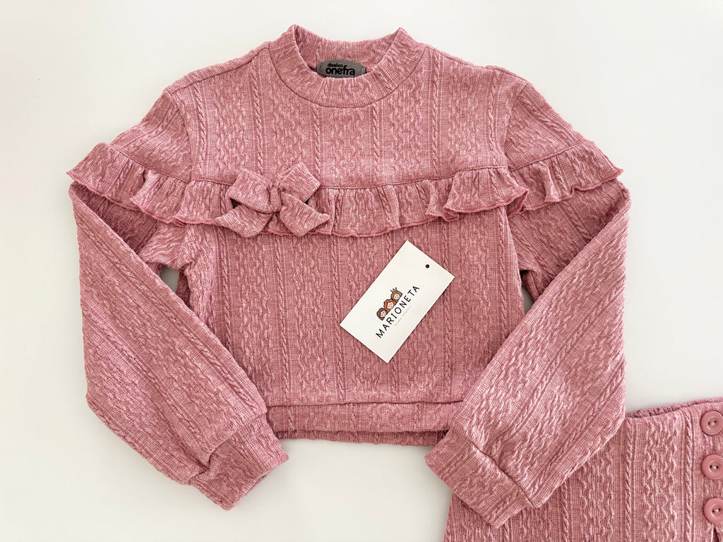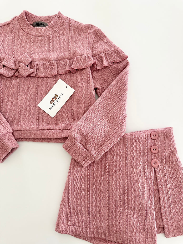 Conjunto dos piezas playera y falda short color rosa para niña.