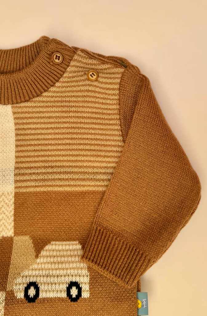 Conjunto dos piezas sueter marino o sueter caki con estampado de carro y pantalon para bebe niño. MARCA MEXICANA
