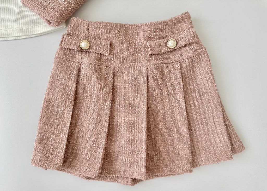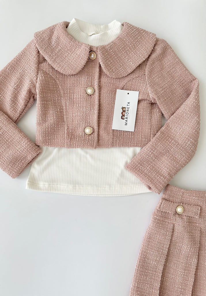 Conjunto tres piezas saco y falda color rosita con playera ivory para niña MARCA MEXICANA