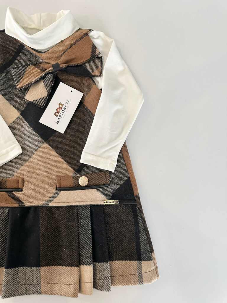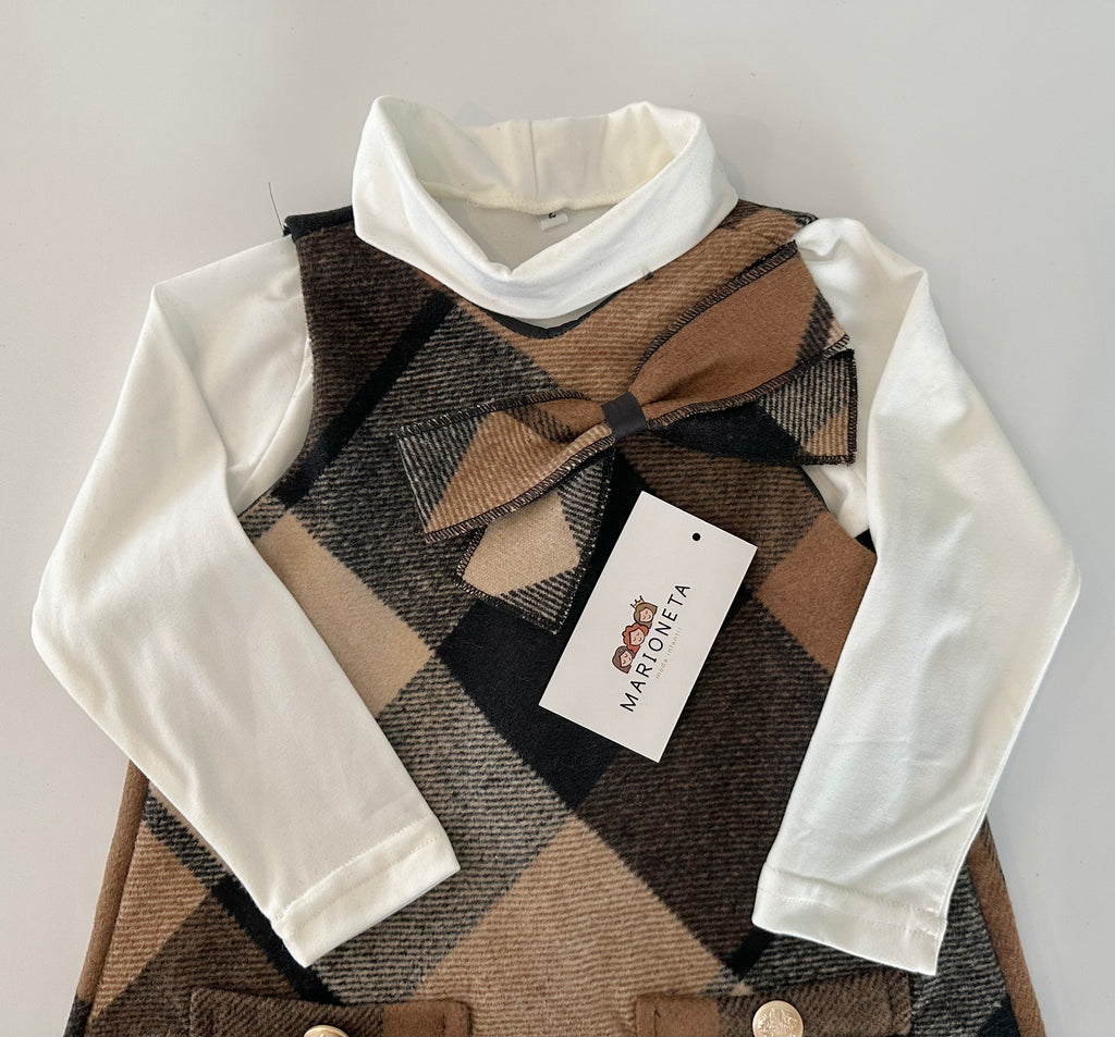 Jumper a cuadros color cafe y playera ivory para niña . MARCA MEXICANA