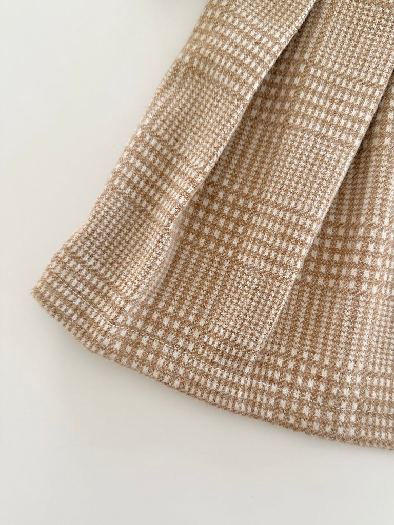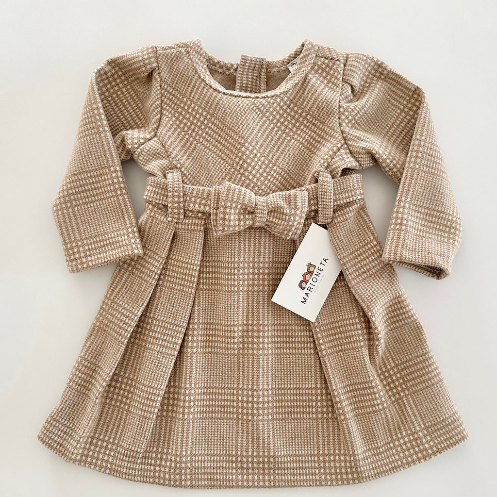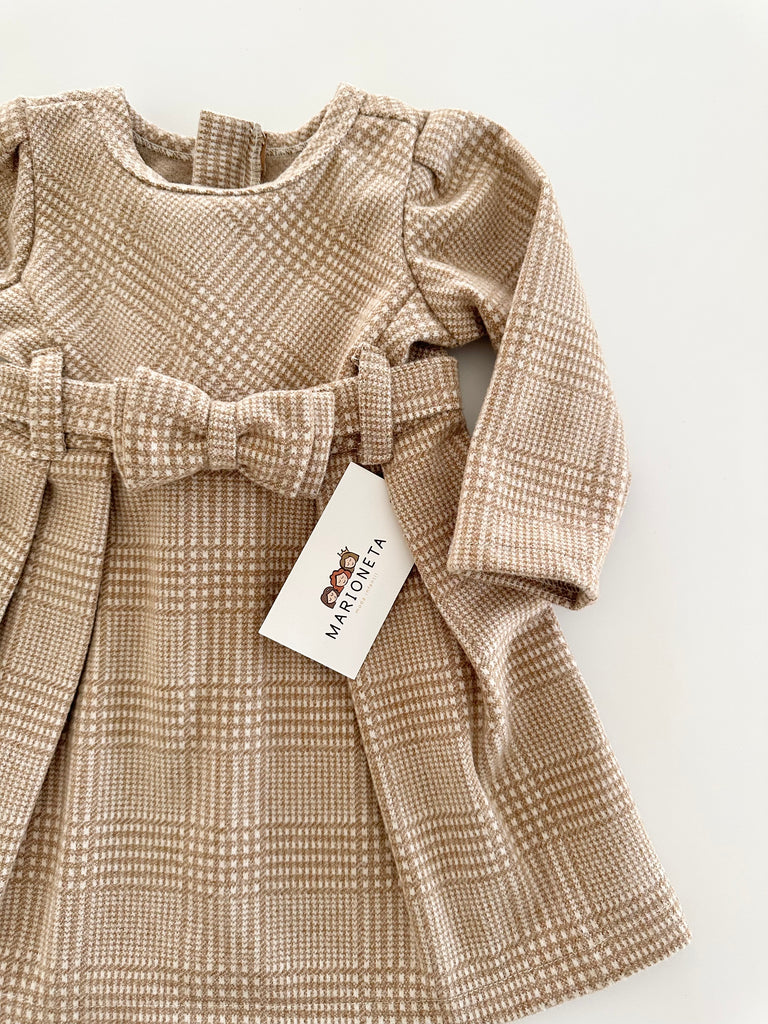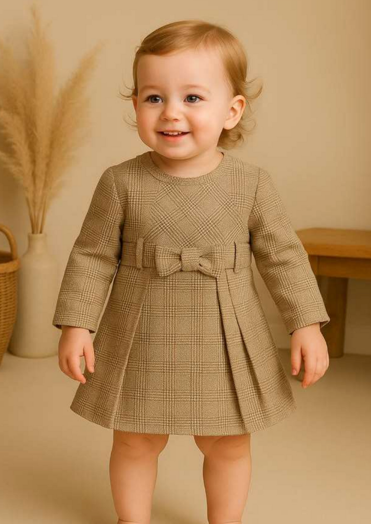 Vestido a cuadros color cafe claro con lazo al frente para niña | MARCA MEXICANA