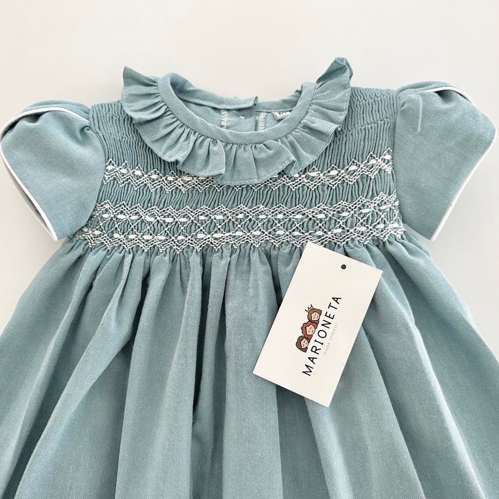 Vestido bordado hecho a mano color azul verde con bordado blanco para niña. MARCA CARPI