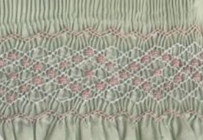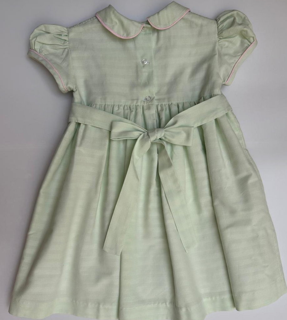 Vestido bordado hecho a mano color verde bajito con bordado rosa para niña. MARCA CARPI
