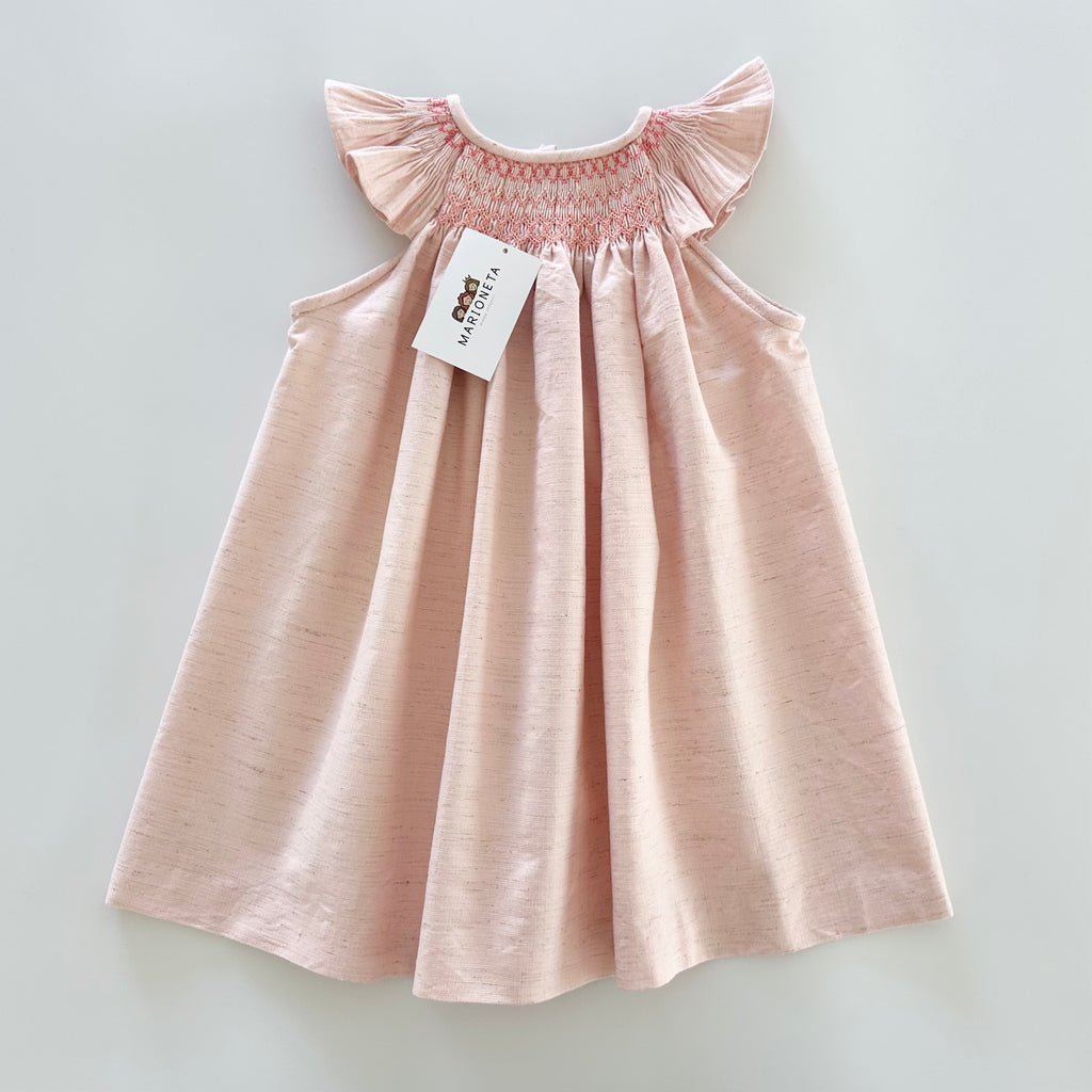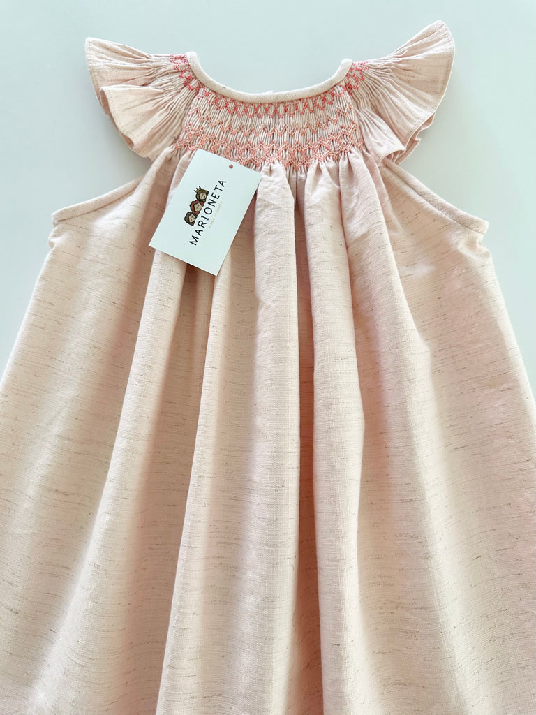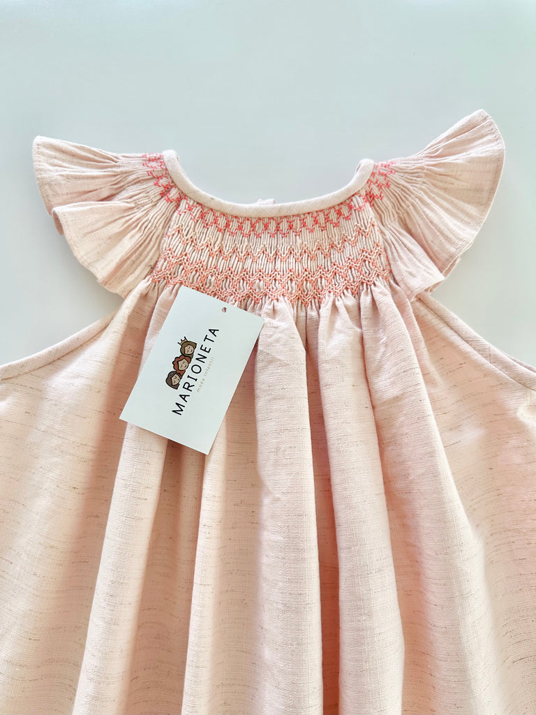 Vestido bordado jesucito hecho a mano color rosa salmon para niña. MARCA CARPI